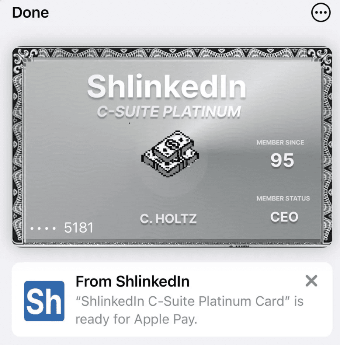 We also reached the #1 spot on Hacker News. Somehow I also ended up creating a ShlinkedIn Platinum debit card that gives 2% cash back.